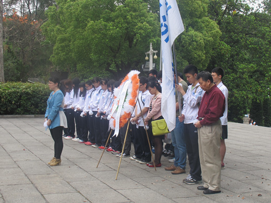 活动伊始,蒋金良书记为同学们介绍了广州起义烈士陵园的历史背景,鼓励同学们珍惜现在的幸福生活,继承和发扬革命先辈艰苦奋斗的精神,时刻缅怀革命烈士为了新中国的成立抛头颅洒热血的革命气概。在李玲老师的领誓下,现场师生庄严宣誓:“继承革命先烈遗志,发奋学习、扎实工作,为全面建成小康社会、建成富强民主文明和谐的社会主义现代化国家、实现中华民族伟大复兴的中国梦而努力奋斗!” 接着,在庄严、肃穆的气氛中默哀三分钟后,师生们怀着崇敬的心情在纪念碑前为革命烈士敬献花圈和纸花,以表达对烈士的深深敬意与无限哀思。