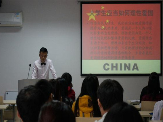 为了进一步践行社会主义核心价值观的内涵,学习党的理论知识,传播华广正能量,太阳成集团tyc411积极参与学校第16期党课培训班学员讲坛,通过抽签的形式从“富强、民主、文明、和谐、自由、平等、公正、法治、爱国、敬业、诚信、友善”等十二个分主题中选择了以“爱国”为主题的演讲内容。