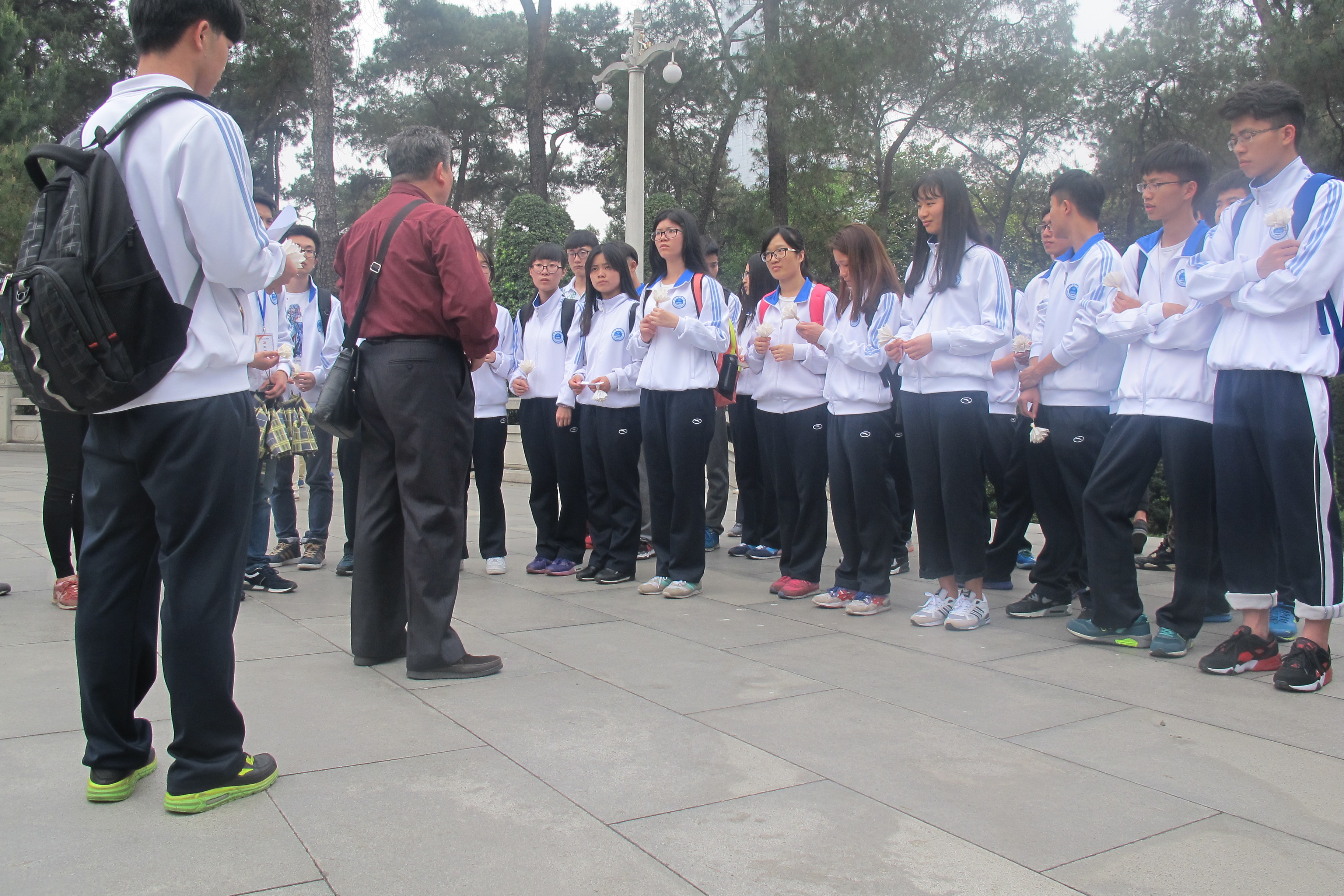 烈士陵墓前,蒋金良书记为同学们介绍了广州起义烈士陵园的历史背景。“与课本上的文字不同,这是最鲜活的历史。”,号召同学们通过参加此次活动铭记历史,缅怀先烈。让同学们深切地体会到,今天的幸福生活是先烈们用生命换来的。我们要珍惜生活,奋发图强,更要学会感恩社会,回报祖国。为表达追思之情,现场全体成员默哀一分钟后,师生们怀着崇敬的心情在纪念碑前为革命烈士敬献花圈和纸花,以表达对烈士的深深敬意与无限哀思。